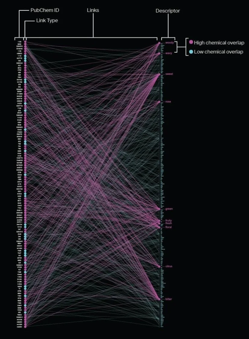 Each scent was associated with anywhere from a few dozen to hundreds of chemicals, each of which contained lists of terms that described the color and odor of the chemical. This brush visualization shows the connections between each unique chemical associated with a particular scent (left) and maps a link to the list of unique descriptive terms (right).