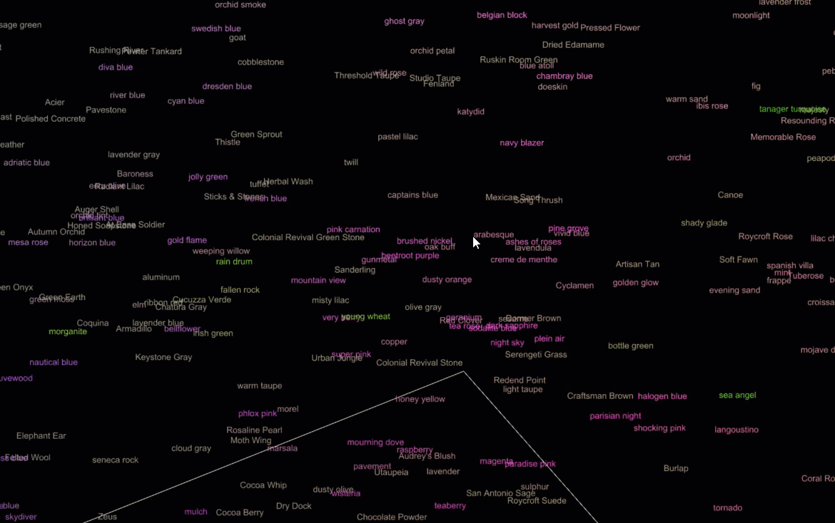 As noted above, this exercise helped to further ideas in how we could use descriptive language to understand the connection between odor, color and experiential metrics. This prompted an effort to try to develop computational tools that would map us to a particular scent based on color inputs. A dataset of Pantone colors was compiled, containing the RGB, Hex code and name of each color. The colors were clustered into groups based on their similarity and the names of colors in each group were pooled together and compared to the scent data.