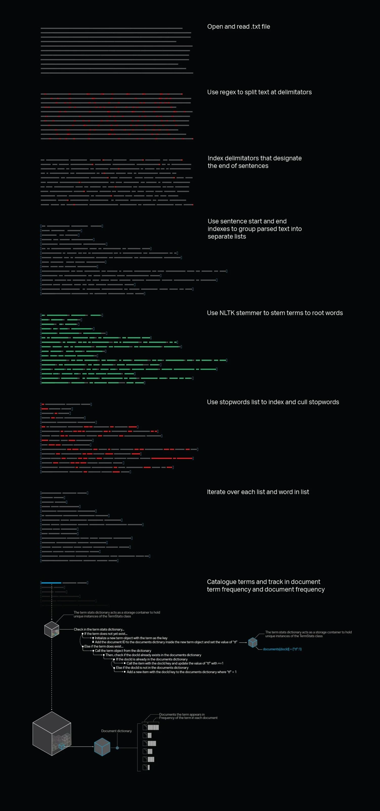 This diagram is intended to provide a high level overview of how raw text is parsed, filtered and structured.