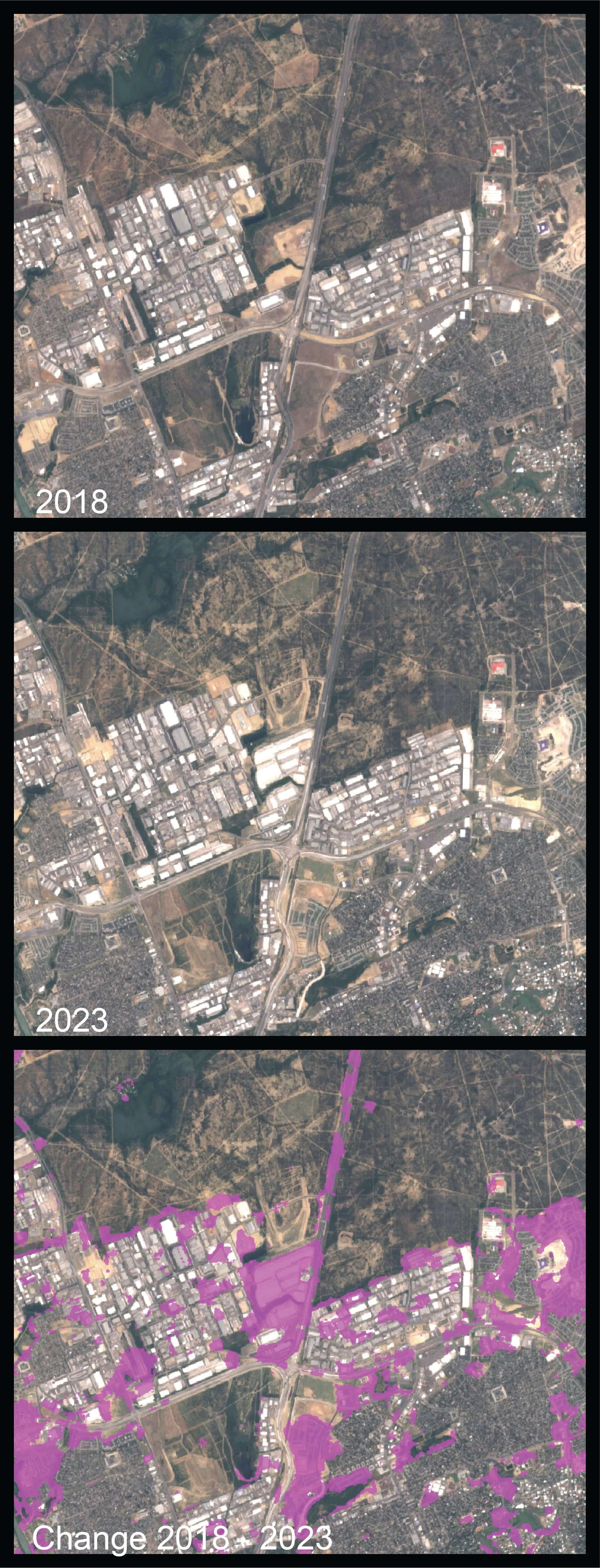 The script was run a total of six times for various time increments. The first run we look at urban material change between imagery form 2018 and 2023 to show the overall difference across the full time window. Then, we can look at year to year changes between 2018-2019, 2019-2020, 2020-2021, 2021-2022 and 2022-2023. Areas that have seen change in urban materials (built structures) appear in magenta masked regions.