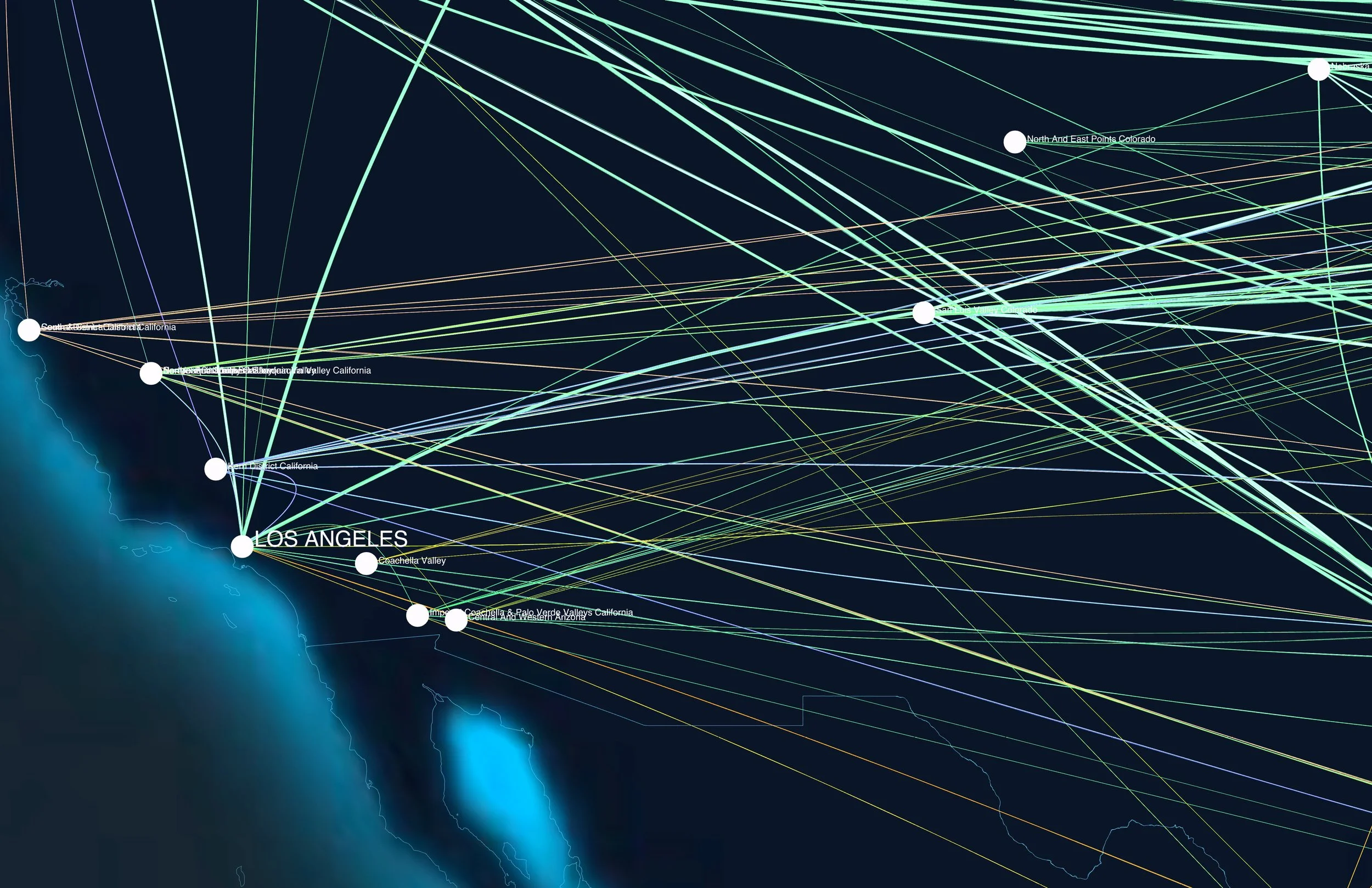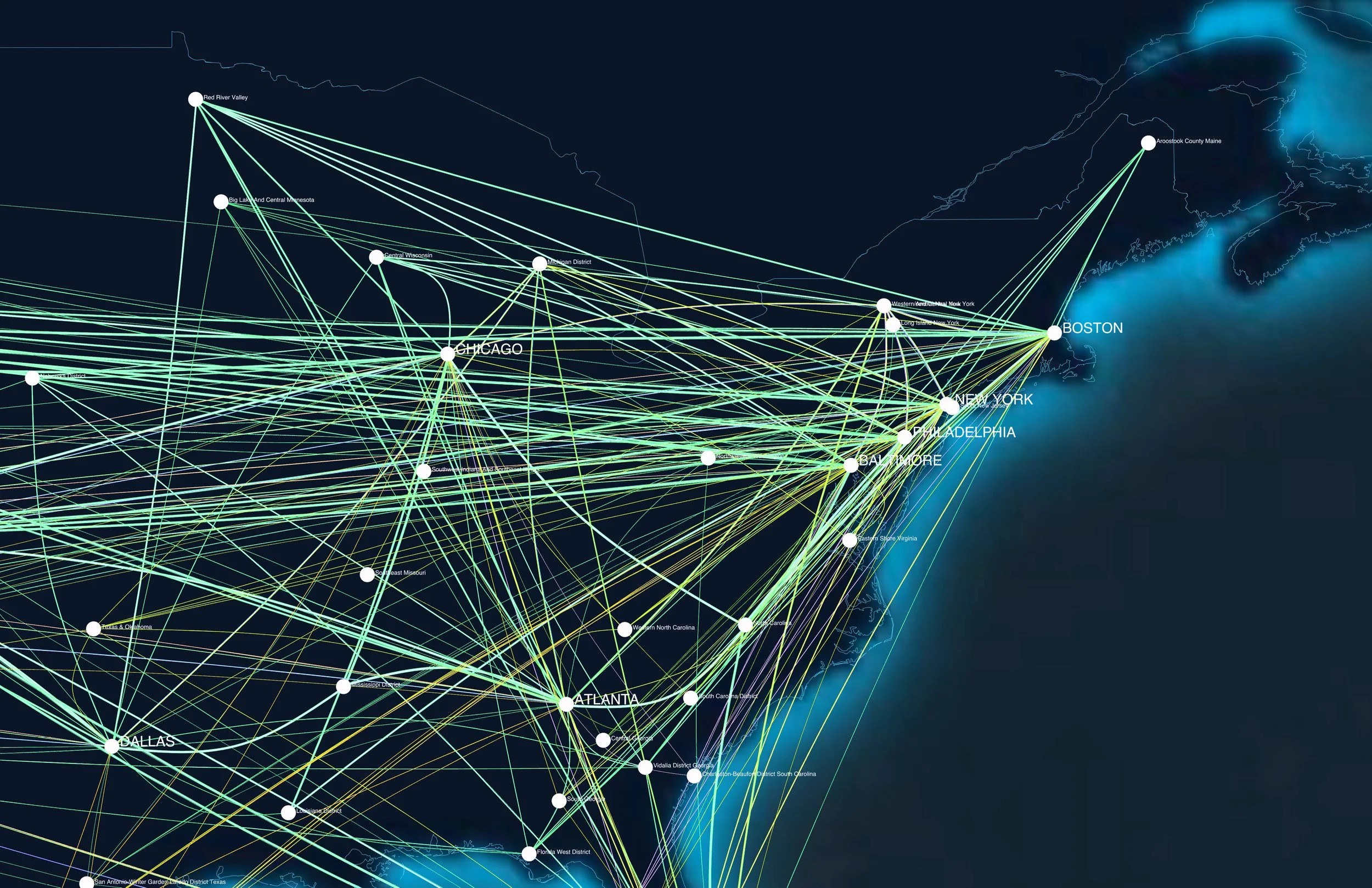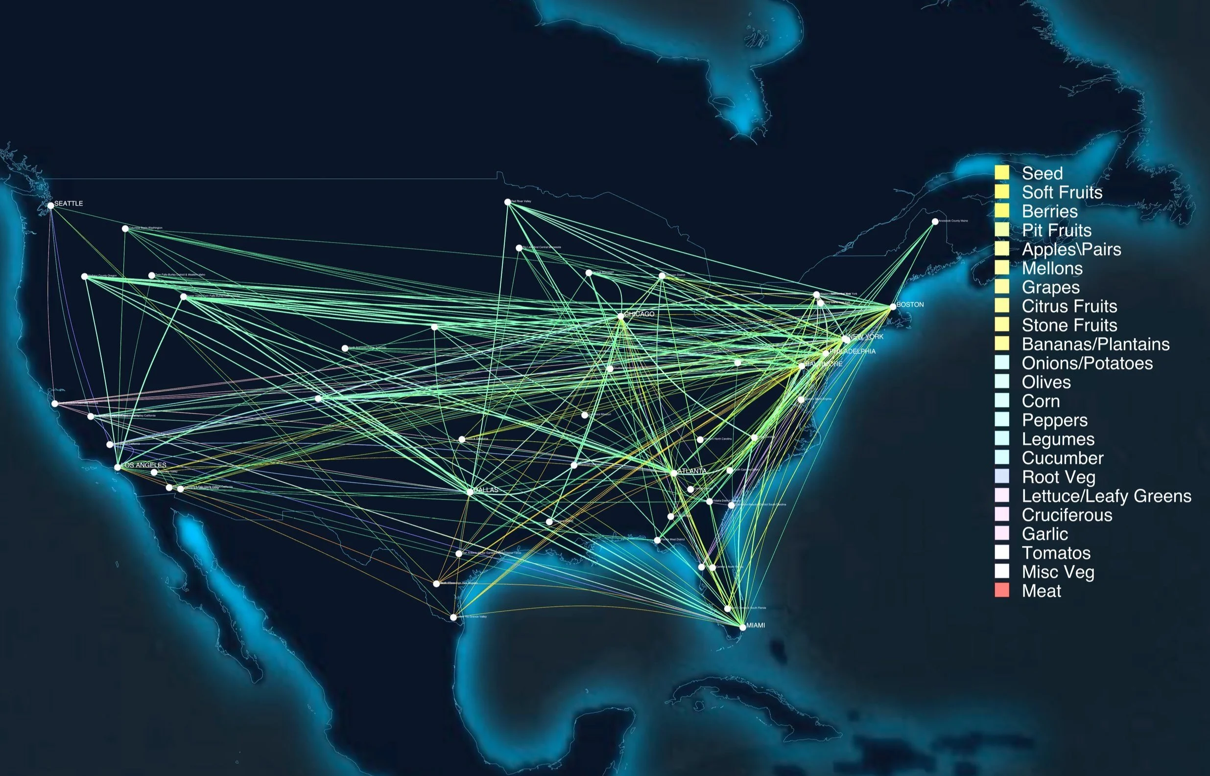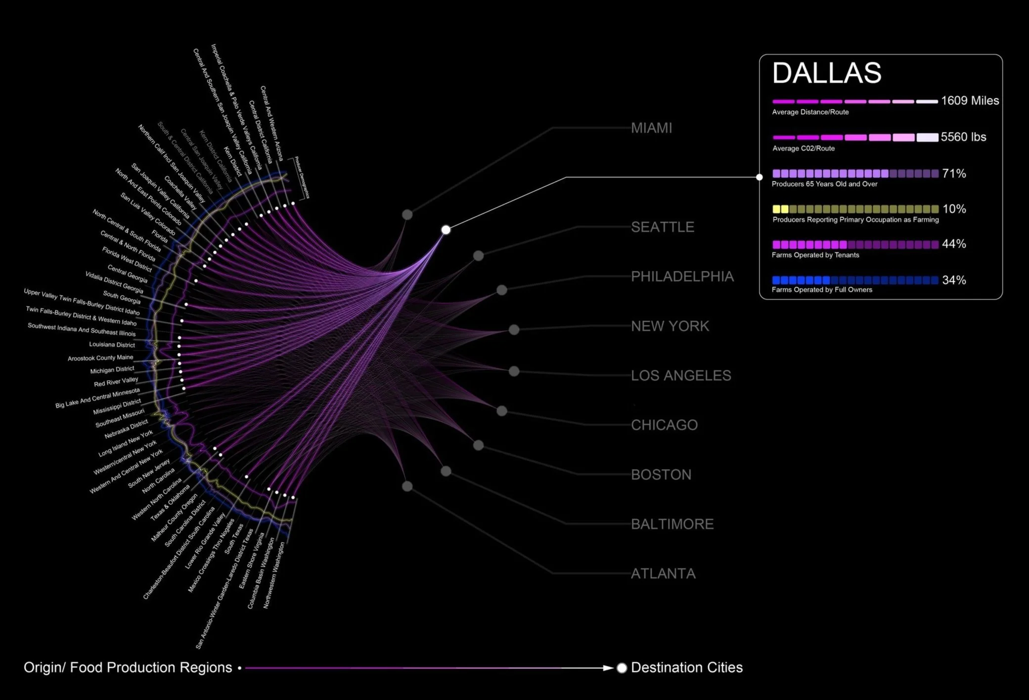 Once the data was finally ready for analysis and visualization, custom tools primarily written with Python and Grasshopper (in Rhino) were developed to make an interactive data analysis and visualization model. The model visualizes freight flows by generating a Bezier curve between the origin and destination and modifying the curve based on the magnitude of freight flow, which was derived from the total amount of freight in pounds transported on that particular route. The radial graphic allows the user to select a specific destination city and see all the places where a particular crop is transported from an overall average distance traveled. This data was also used to estimate the carbon footprint of transportation by taking the average highway miles per gallon of a refrigerated truck, average weight of the truck and distance traveled.